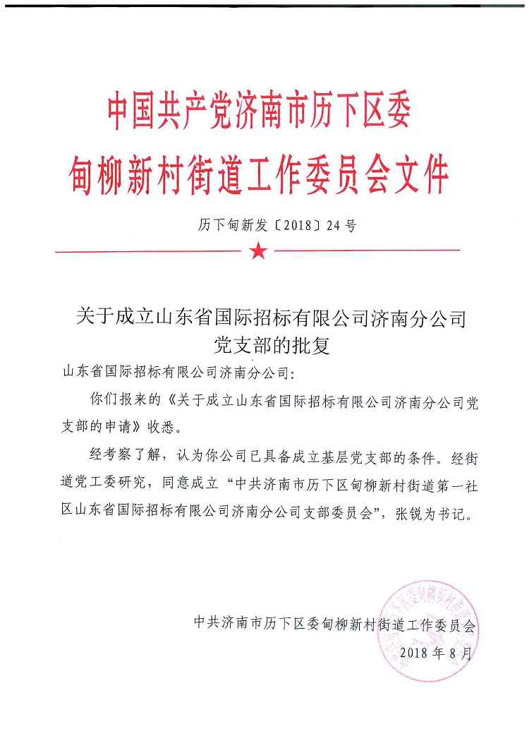 2018年8月中共濟(jì)南市歷下區(qū)甸柳新村街道第一社區(qū)山東省國(guó)際招標(biāo)有限公司濟(jì)南分公司支部委員會(huì)成立!