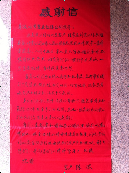 工作人員的熱情細(xì)致的服務(wù)態(tài)度,給陳斌先生及家人留下深刻印象。事后,為了表達感激之情,陳先生送來親筆抒寫的感謝信,寫道:“在構(gòu)建和諧社會的時代里,他們以熱情助人,拾金不昧的精神傳遞著正能量!同時,安慶市房屋置業(yè)擔(dān)保公司的安全保衛(wèi)措施也使我們客戶更加放心!”